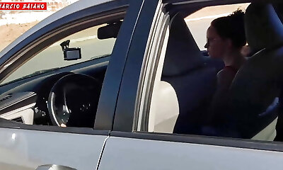 Excited girlfriend stops her beau's car to blow him with intensity