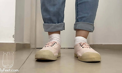 White socks and dirty pink sneakers footjob and jizz on soles, socks, and sneakers